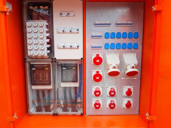 - 2x CEE 125A 5-pol mit Trenner für NH00/000 Sicherungen (max. Absicherung mit 100A mäglich) je Steckplatz und RCD Typ A/500mA je Steckplatz